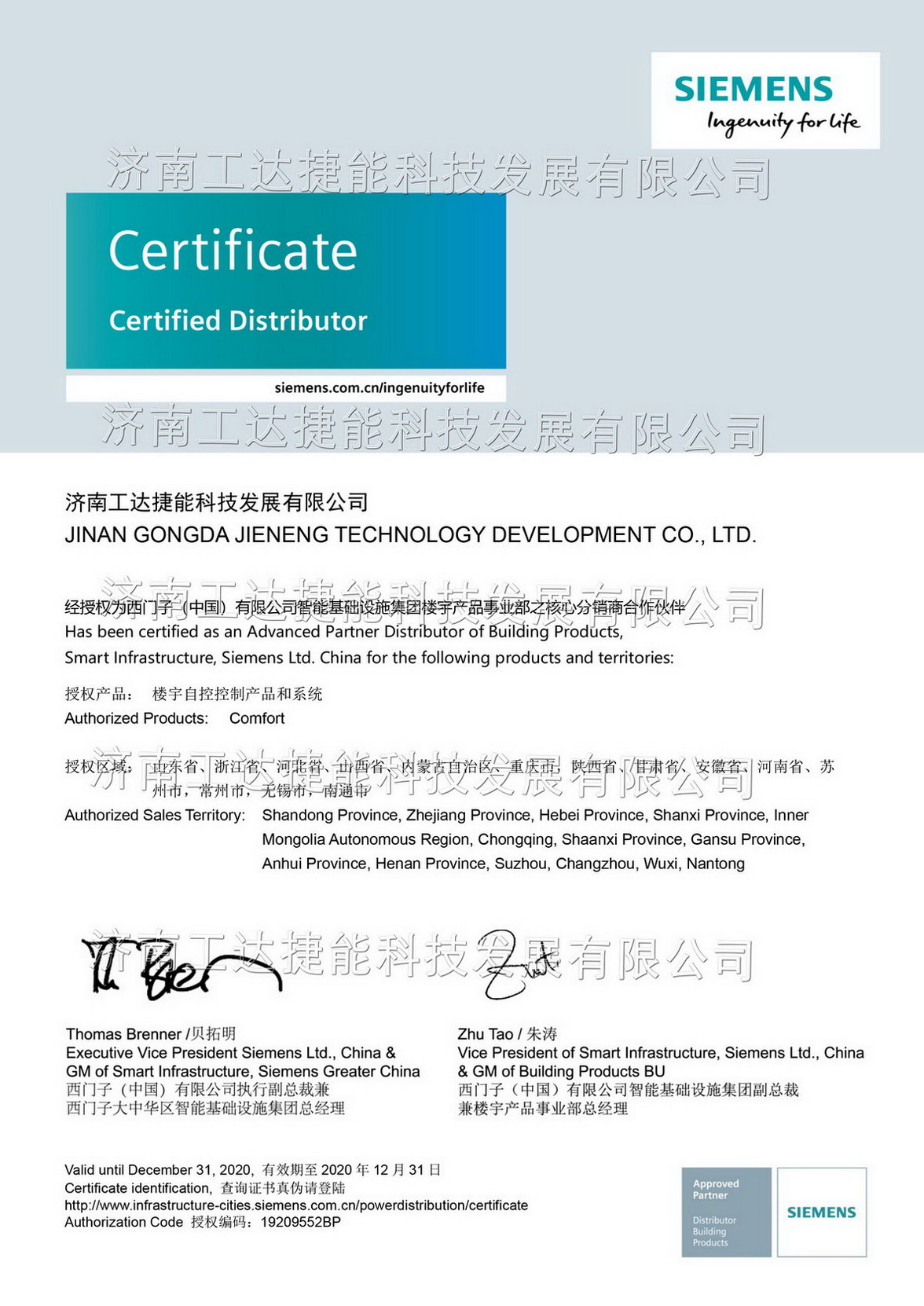 西門子樓宇科技2020年代理證書-濟南工達捷能科技發(fā)展有限公司